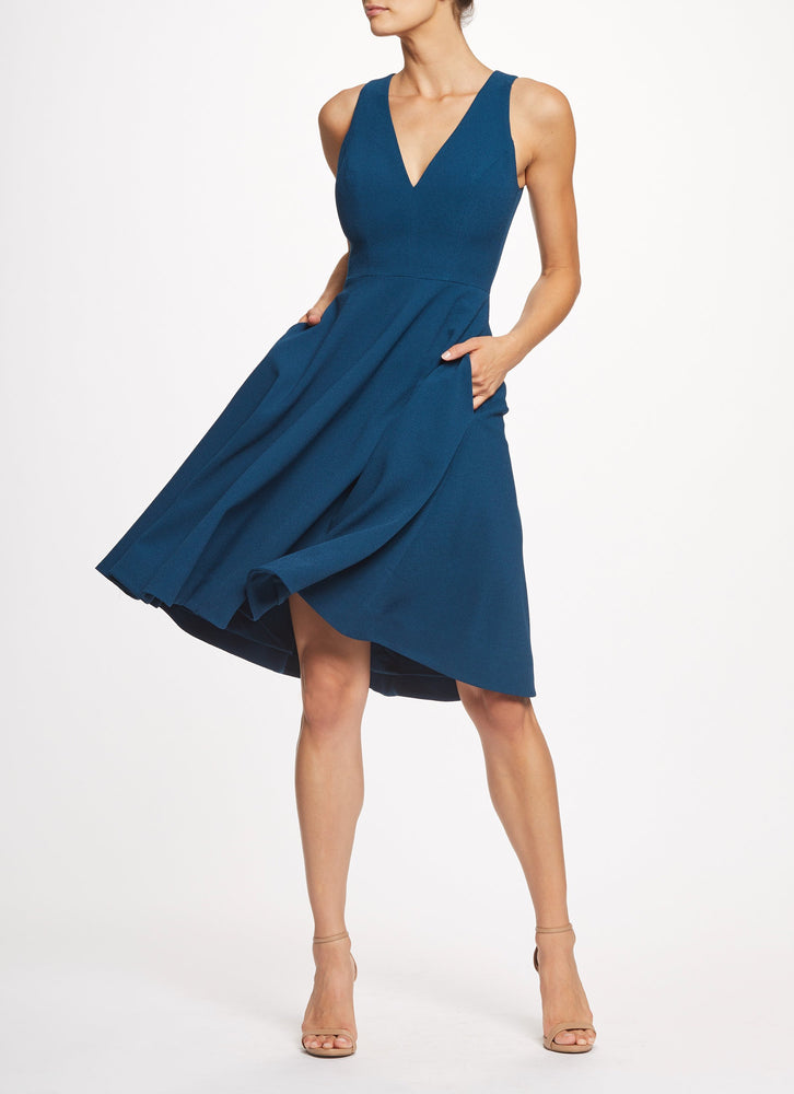 Be the belle of the ball in the Catalina Crepe Fit and Flare in Peacock Blue. The knee length of the Catalina is sweet, while the fit and flare style flatters all body shapes.